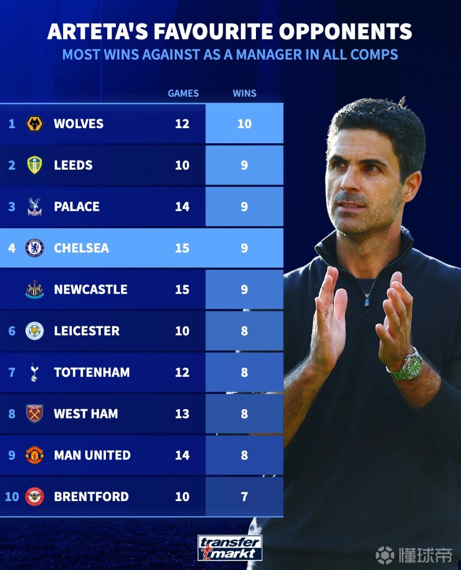 塔帅生涯赢球场次最多的10个对手:15战切尔西9胜排名第4