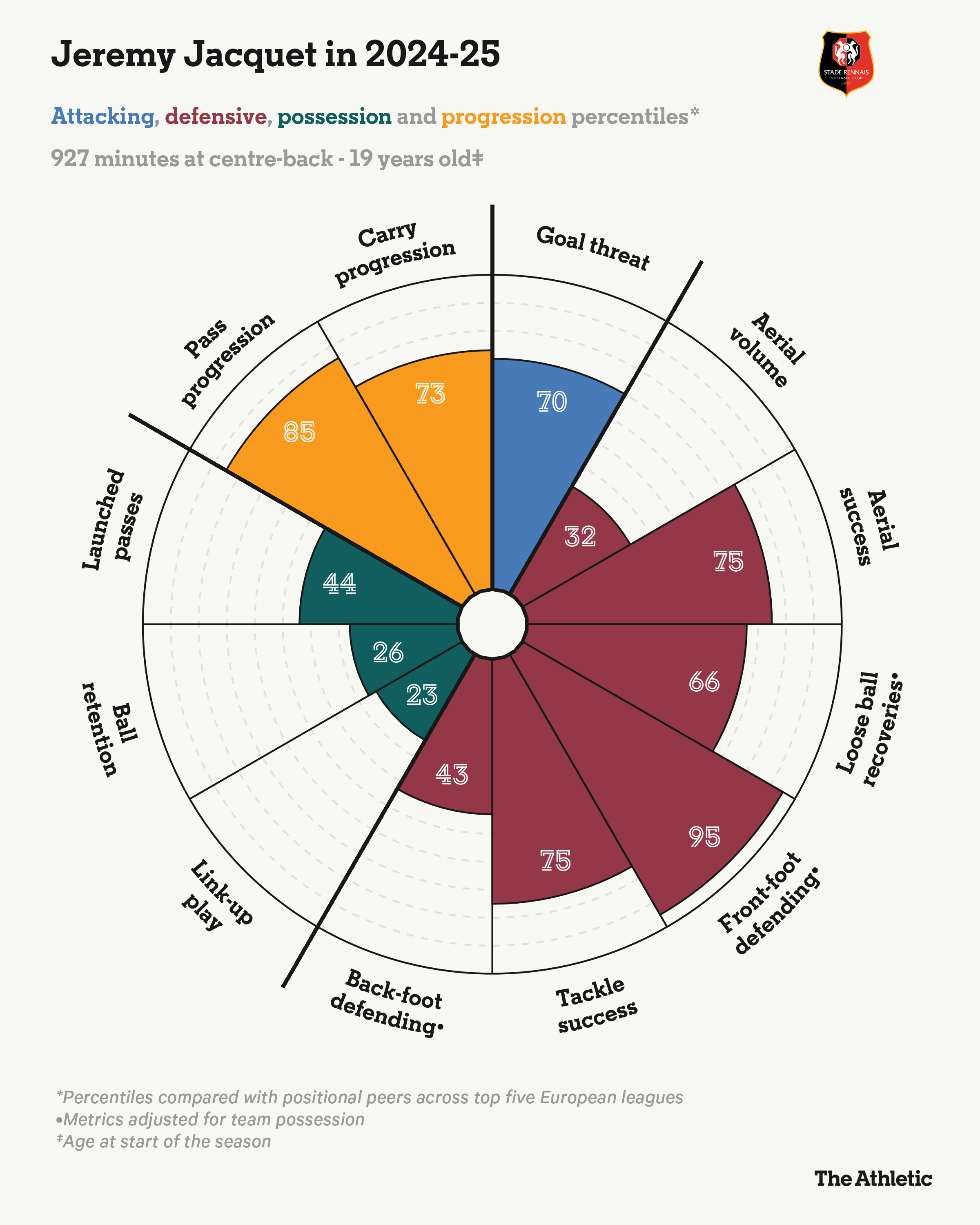 评估中后卫有其挑战性,因为防守数据难以量化,这是由于影响因素众多。对于雅凯来说,可供参考的样本量也有限,他曾代表雷恩一线队出场31次,并代表法乙球队克莱蒙出场24次,他在2024-25赛季开始时被租借到克莱蒙,之后被召回。不过,在欧洲五大联赛中,只有三名U21球员在中后卫位置上的出场时间比雅凯更多。